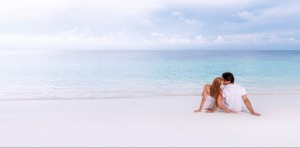 Rear view of loving couple relaxing on the beach, kissing outdoors, boyfriend with girlfriend enjoying summer holidays on luxury Maldives resort, love and romance concept